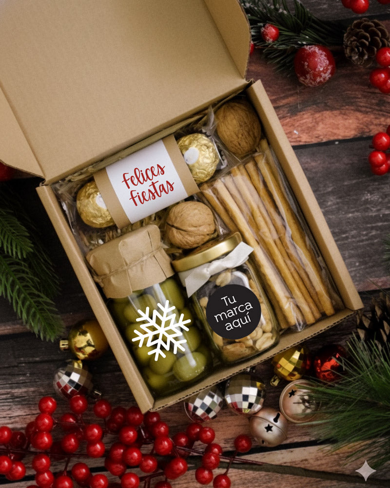 Caja decorada con lazo y tarjeta con mensaje personalizado.