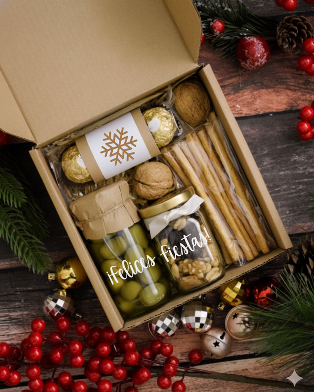 Caja decorada con lazo y tarjeta con mensaje personalizado.