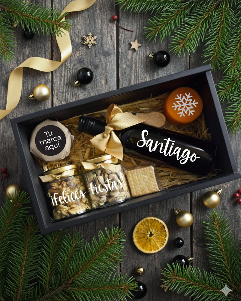 Caja decorada con lazo y tarjeta con mensaje personalizado.