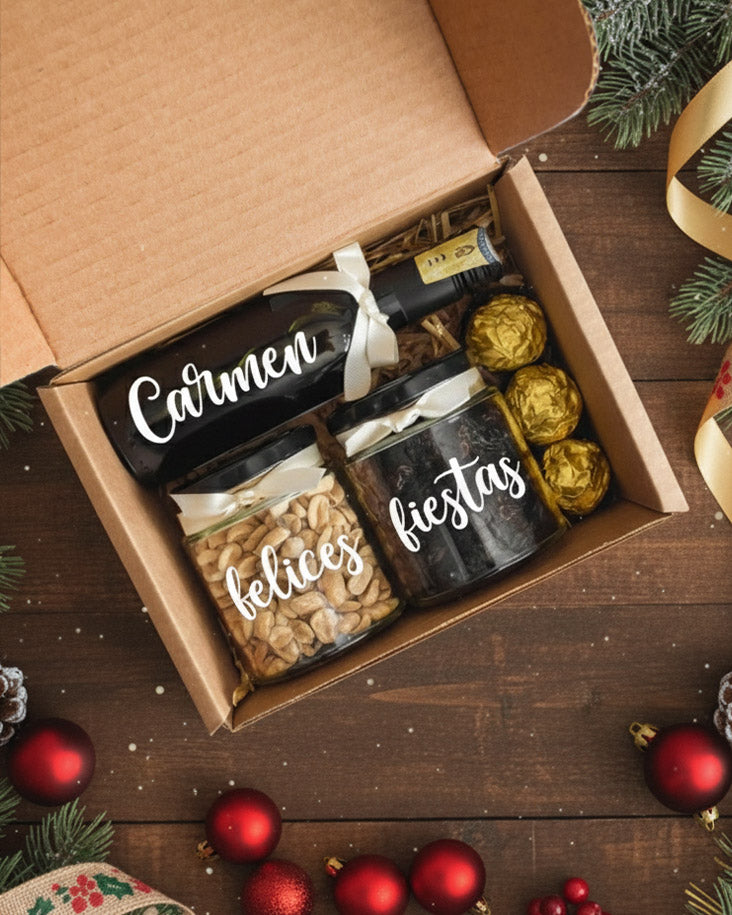 Caja decorada con lazo y tarjeta con mensaje personalizado.