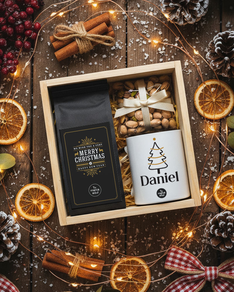 Caja decorada con lazo y tarjeta con mensaje personalizado