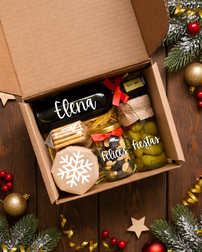 Caja decorada con lazo y tarjeta con mensaje personalizado.
