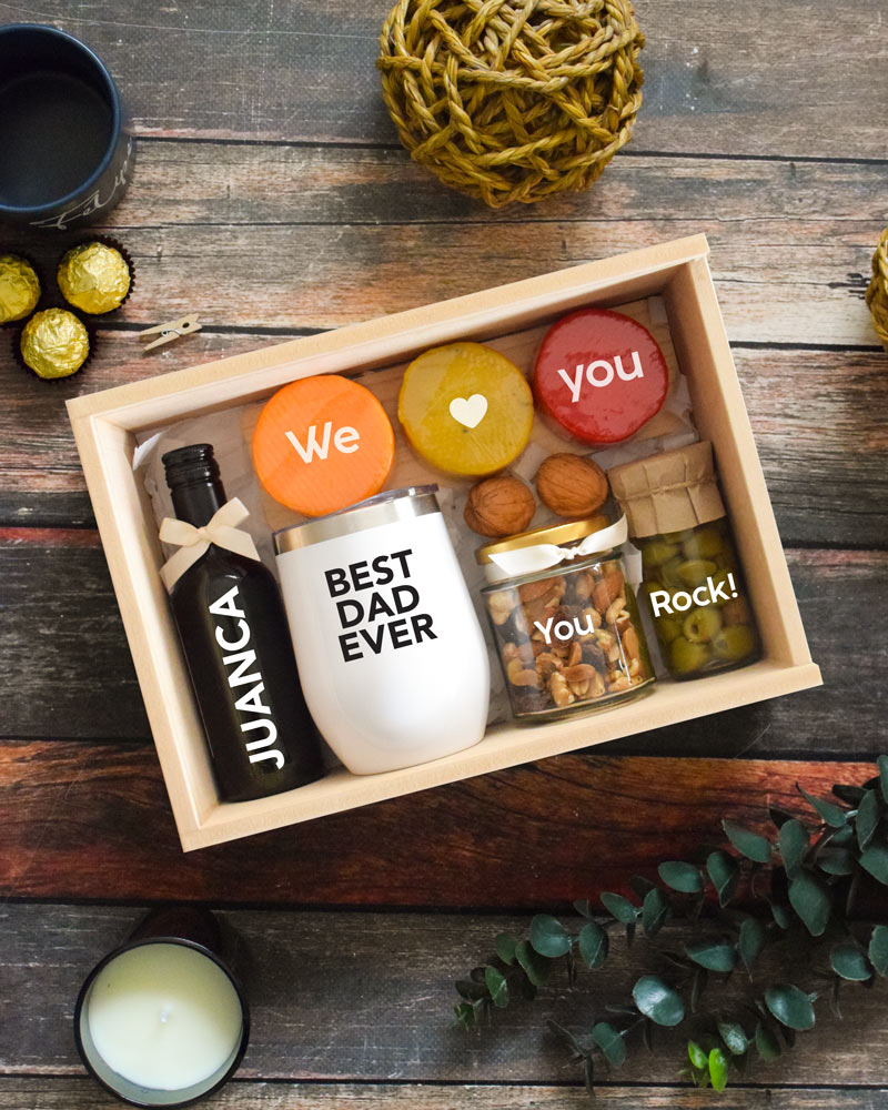Caja decorada con lazo y tarjeta con mensaje personalizados