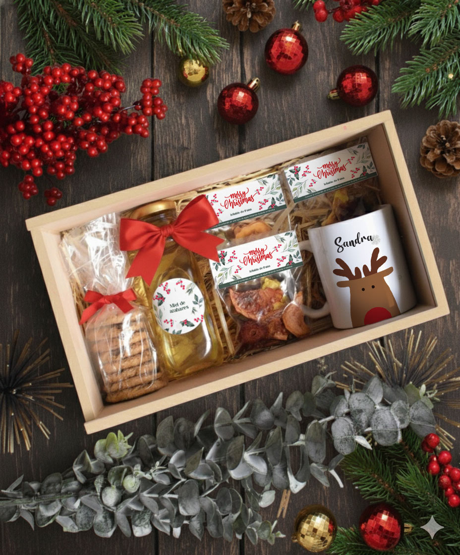 Caja decorada con lazo y tarjeta con mensaje personalizado.