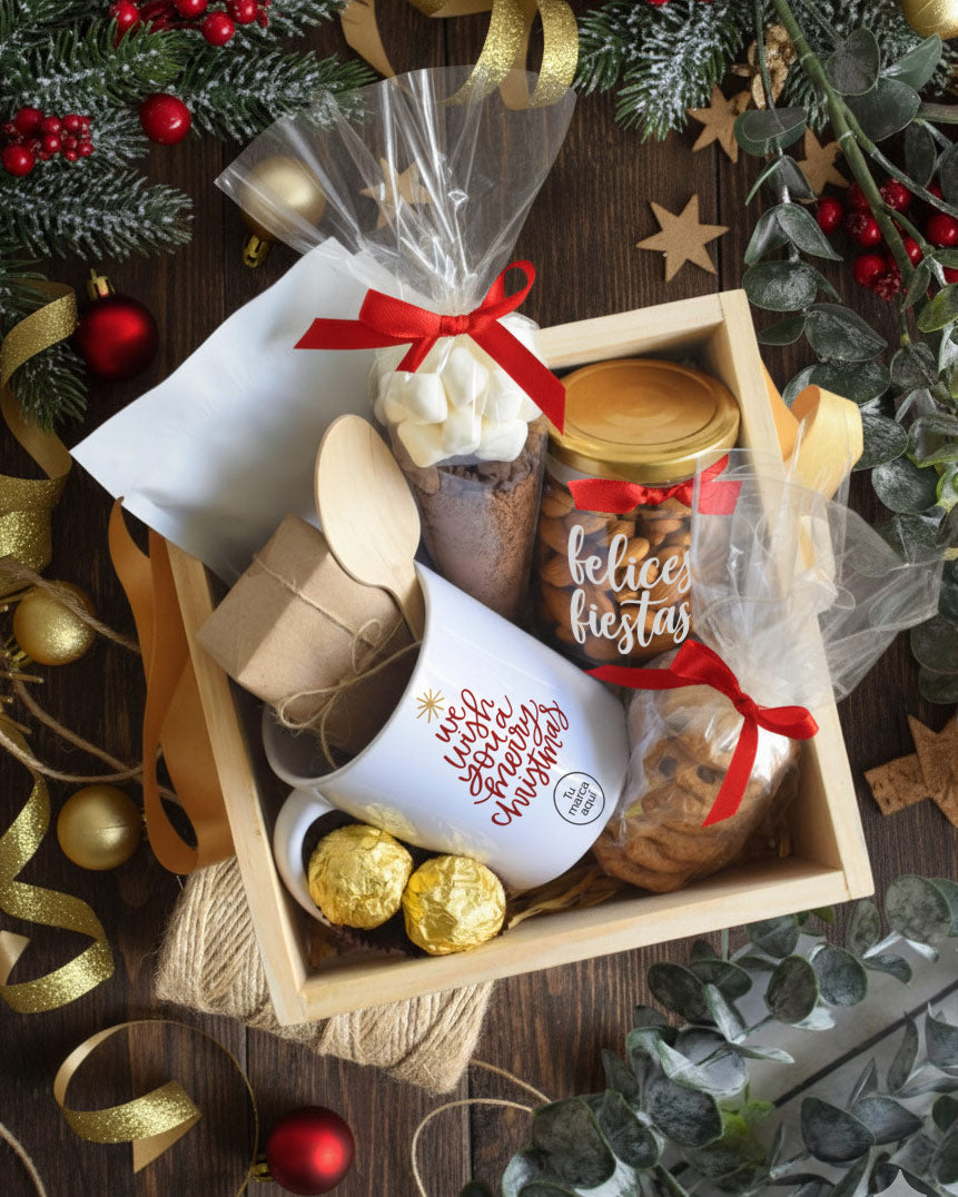Caja decorada con lazo y tarjeta con mensaje personalizado.