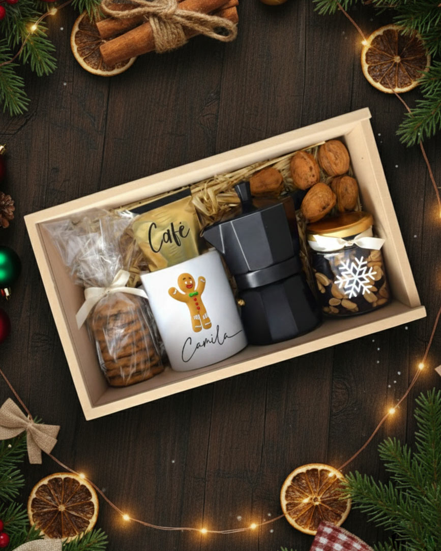 Caja decorada con lazo y tarjeta con mensaje personalizado.