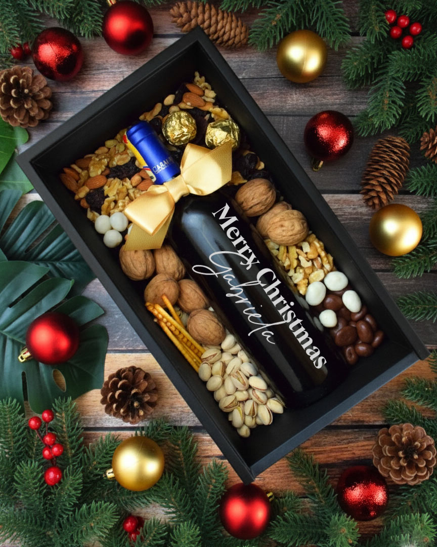 Botella de vino tinto personalizada con nombre y adhesivo impreso.