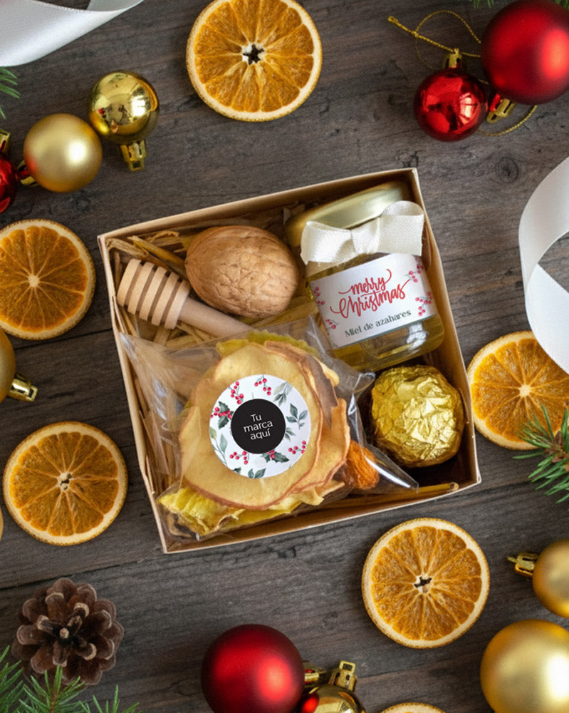 Caja de cartón decorada con cinta y tarjeta con mensaje personalizado