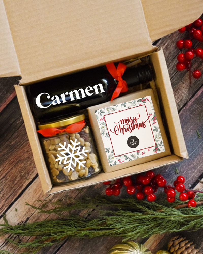 Caja decorada con lazo y tarjeta con mensaje personalizada