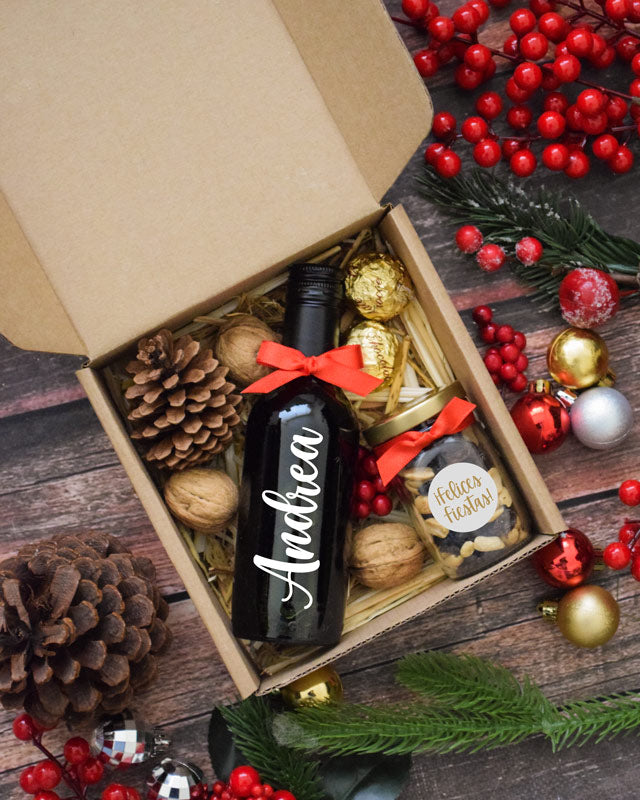 Caja decorada con lazo y tarjeta con mensaje personalizado.