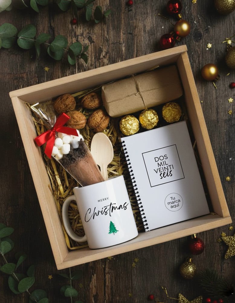 Caja decorada con lazo y tarjeta con mensaje personalizado.