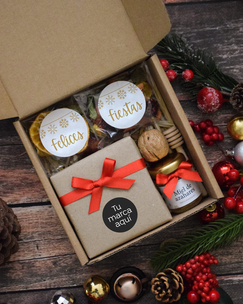 Caja decorada con lazo y tarjeta con mensaje personalizado.