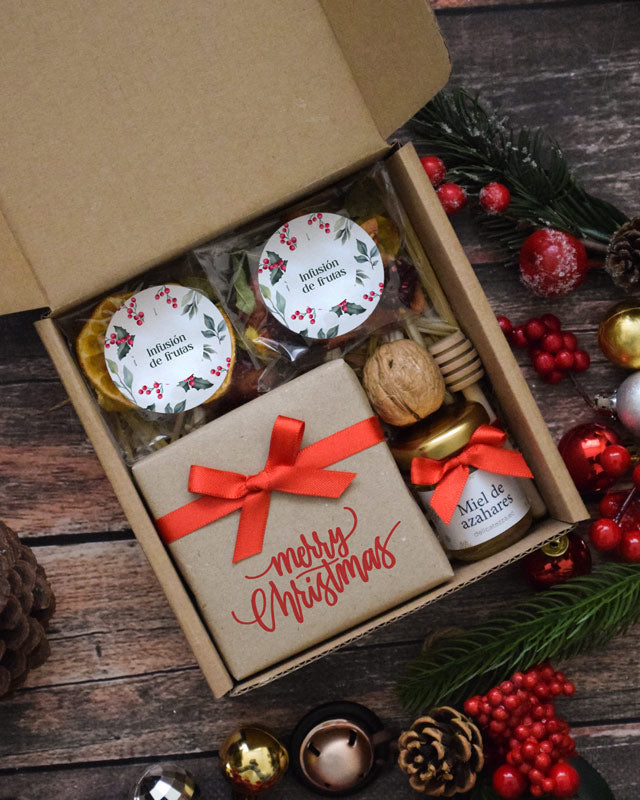Caja decorada con lazo y tarjeta con mensaje personalizado.