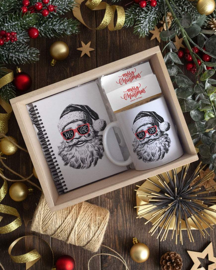 Caja decorada con lazo y tarjeta con mensaje personalizado.