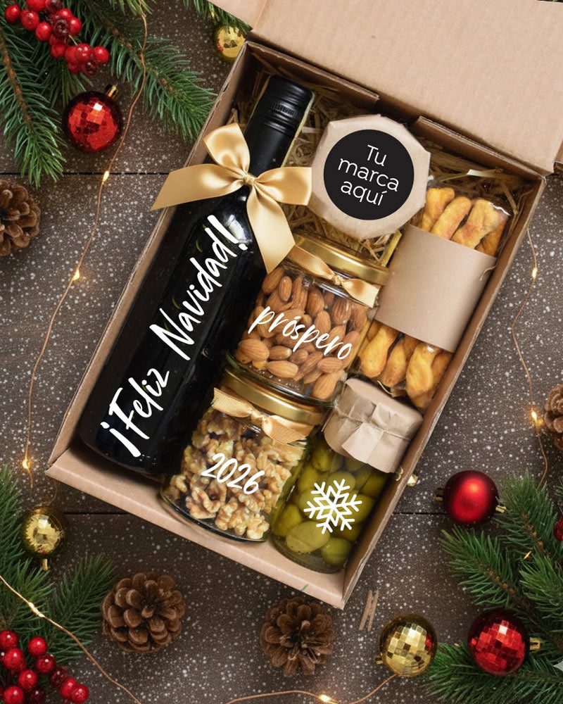 Caja decorada con lazo y tarjeta con mensaje personalizado.