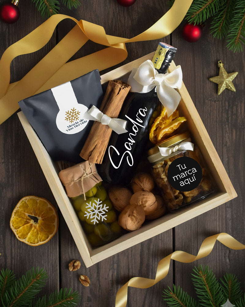 Caja decorada con lazo y tarjeta con mensaje personalizado.