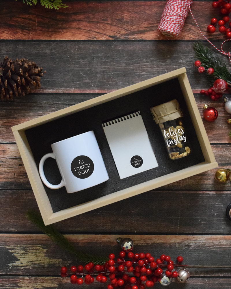 Caja decorada con lazo y tarjeta con mensaje personalizado.