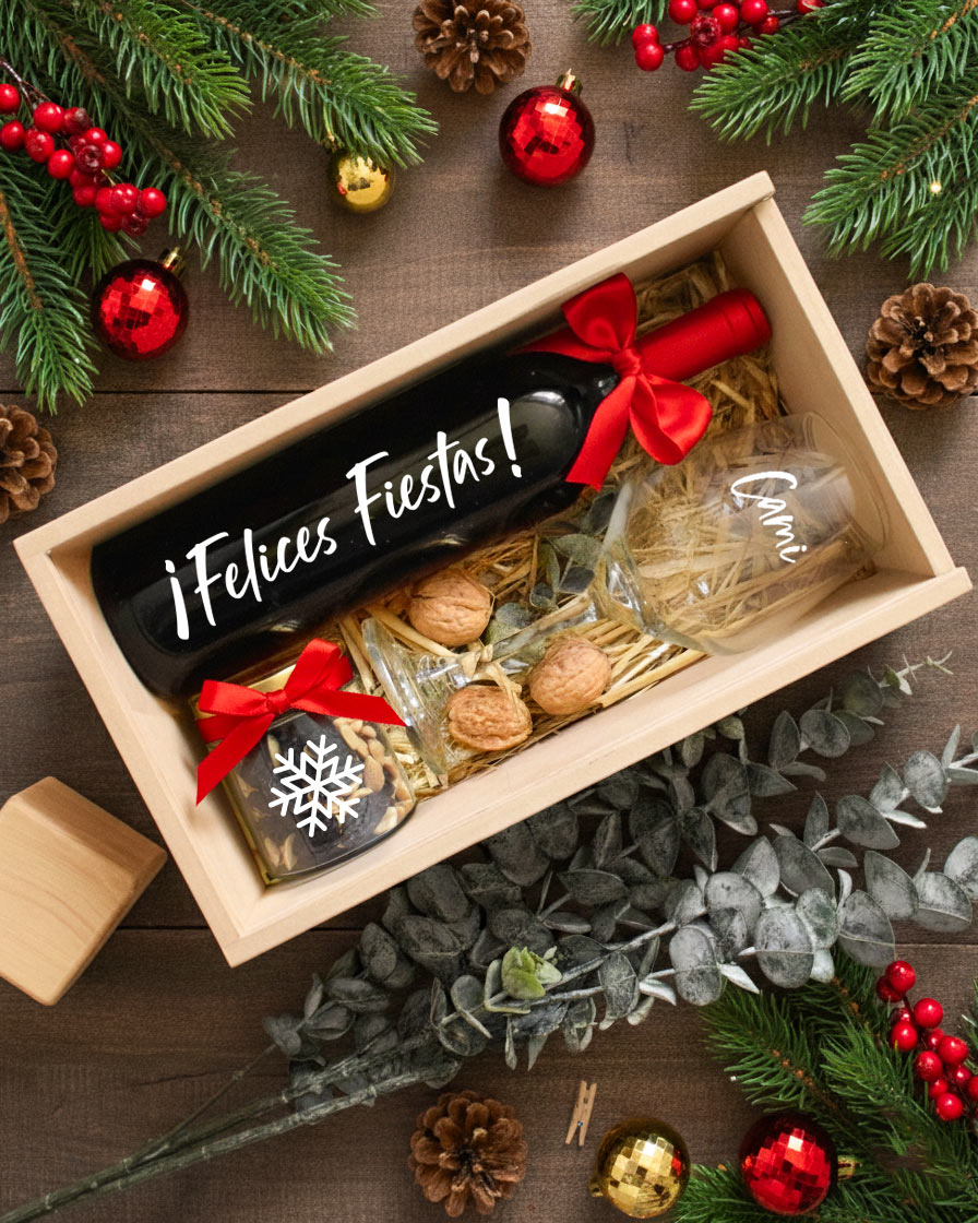 Caja decorada con lazo y tarjeta con mensaje personalizado.