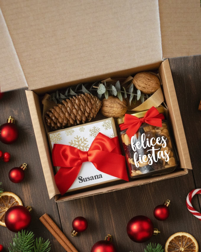 Caja decorada con lazo y tarjeta con mensaje personalizado