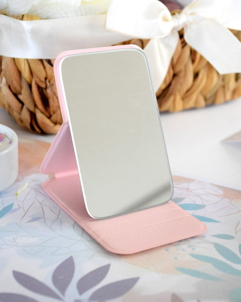 Espejo pequeño con forro rosado.